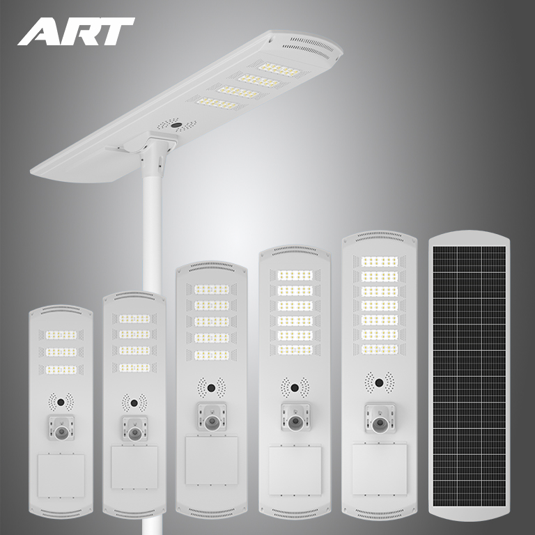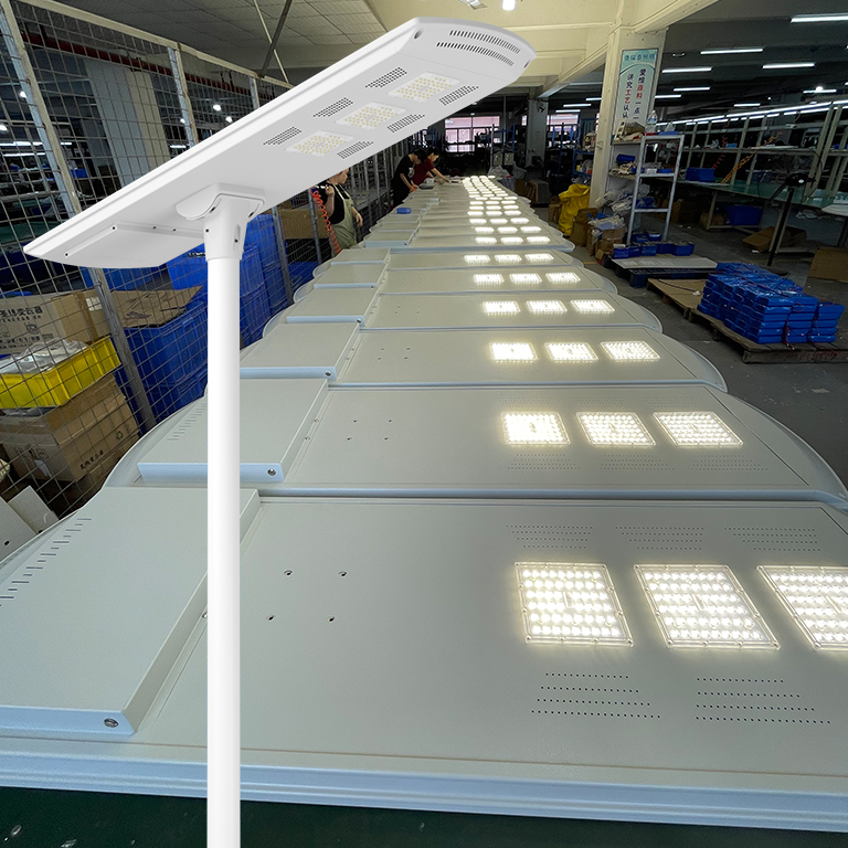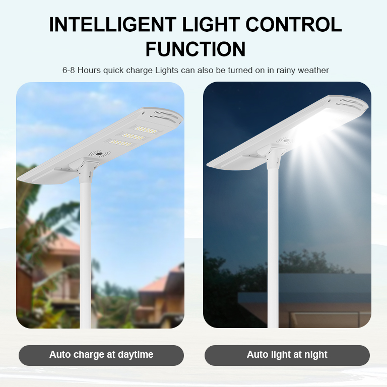 Street light uses solar power to store electricity in lithium batteries during the day and supplies the electricity from the lithium batteries to LEDights at night. The all in one solar light can light for 12 hours at night,and support on rainy and snowy days. it canprovide brightness for 6-8 days or rainy days.